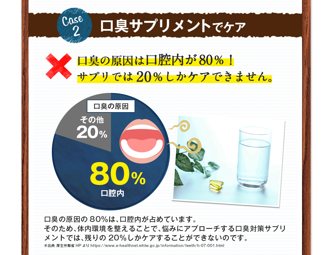 また歯磨きをしているから口臭の原因は口内ではないと思っている方もいるようですが、口臭の原因は80%が口内にあるとされています。