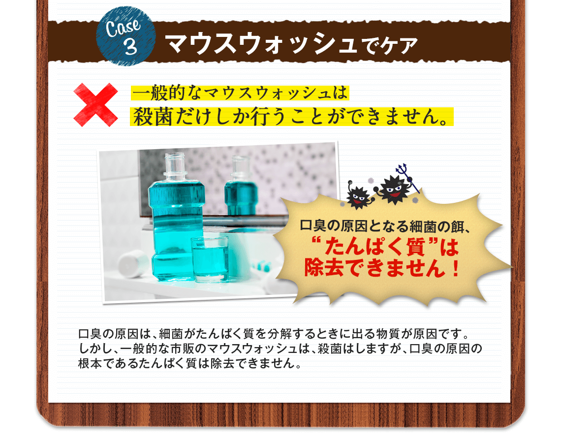 一般的なマウスウォッシュでは口内の殺菌だけを行うものが多く、それでは口内の掃除は不十分でした。