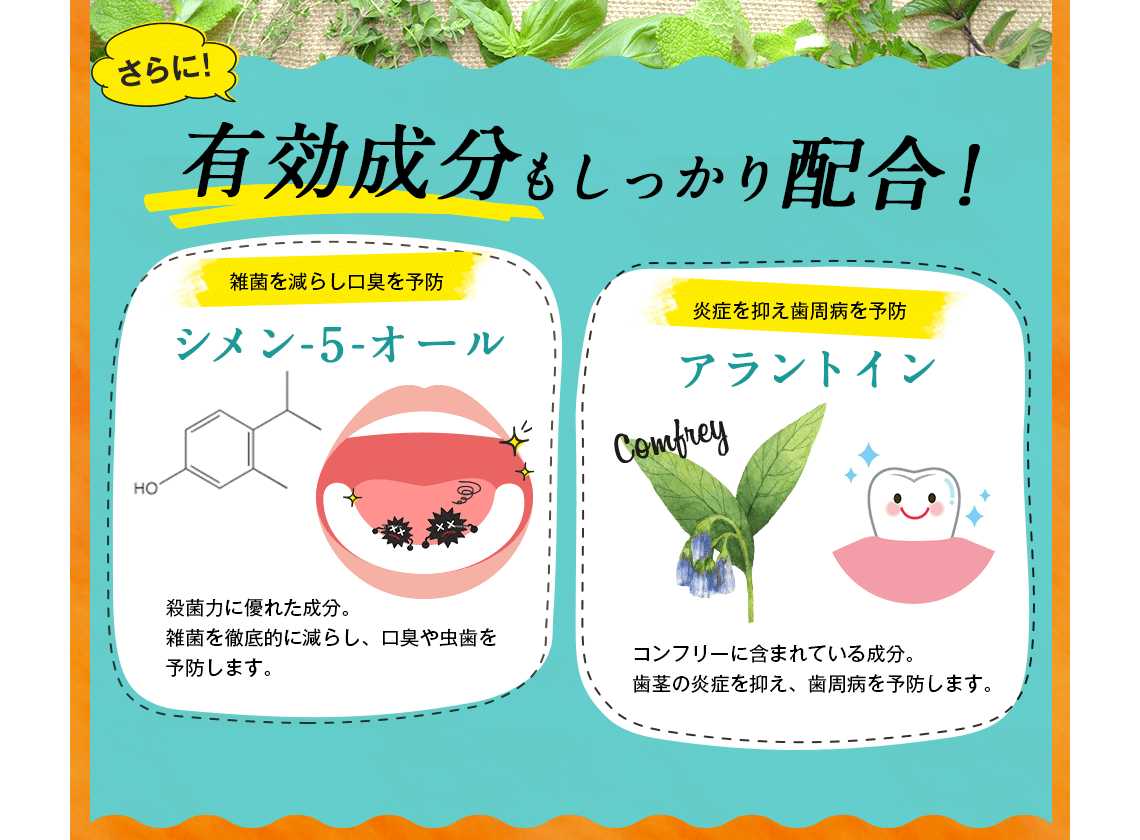 更に”アラントイン”という成分は歯茎の炎症を抑えて歯周病を予防してくれる効果が期待できます。